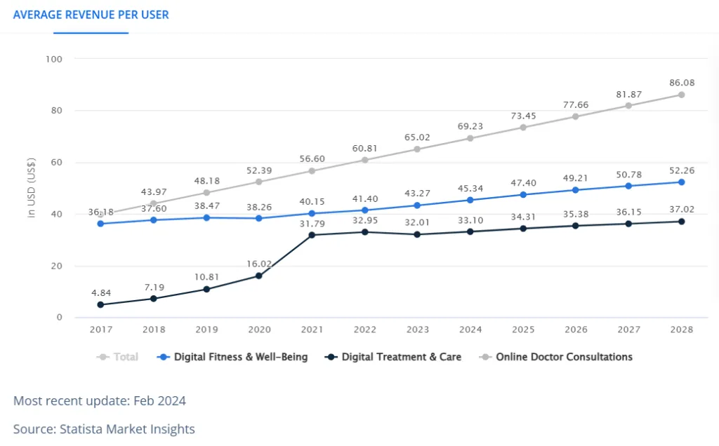 In a recent analysis by our team at Market Research Thailand, it was found that Thailand’s Digital Health market is set for significant expansion in the coming years. Revenue is expected to hit USD 1.03 billion by 2024, driven by a rising adoption of digital health solutions. A notable increase in telemedicine usage shows that more patients are opting for remote healthcare consultations. The anticipated average revenue per user (ARPU) is projected to be USD 42.78, illustrating the growing investment in digital health services.