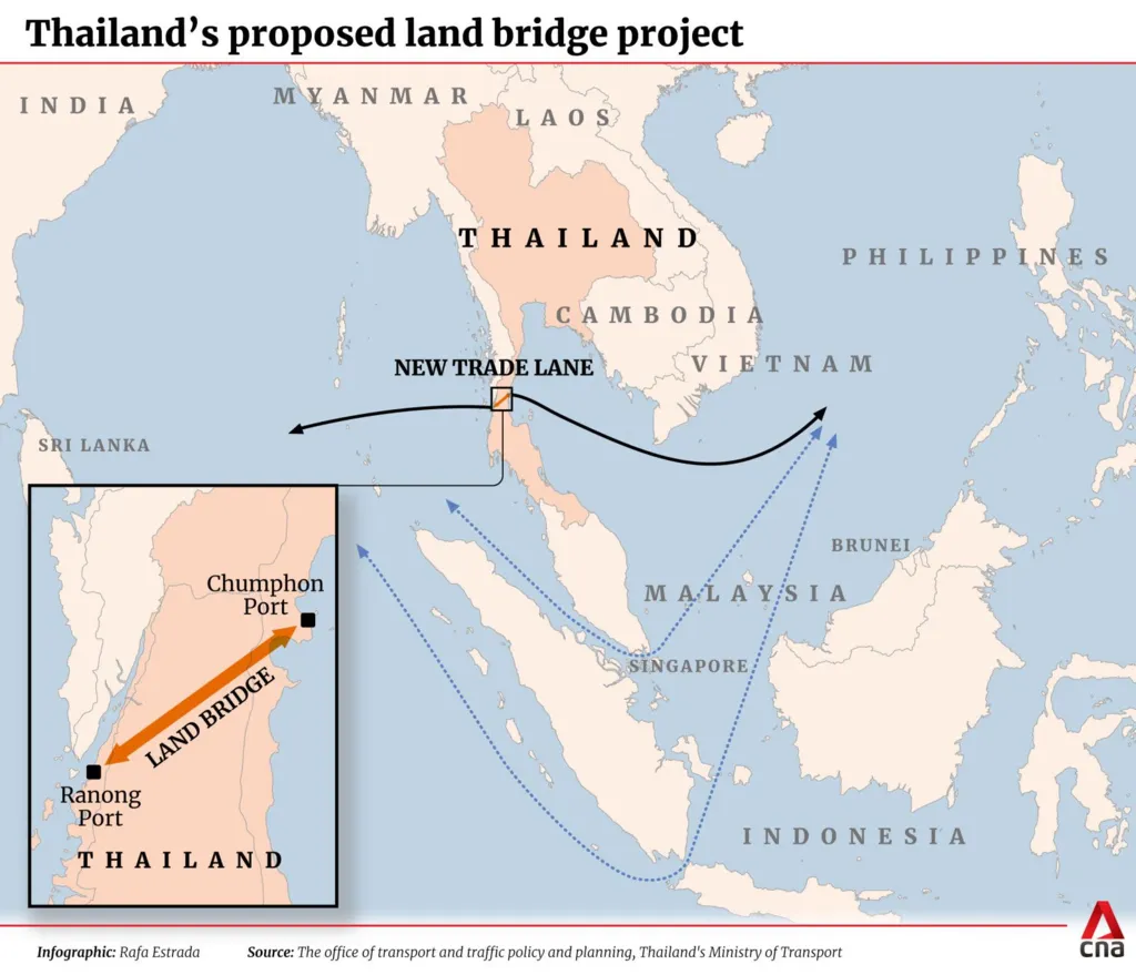 Thailand’s Landbridge positions itself as an alternative. Instead of sailing through Singapore and Malaysia, cargo would unload on one coast, move across southern Thailand by road and rail, and reload on the other side. The promise is speed, resilience, and diversification.