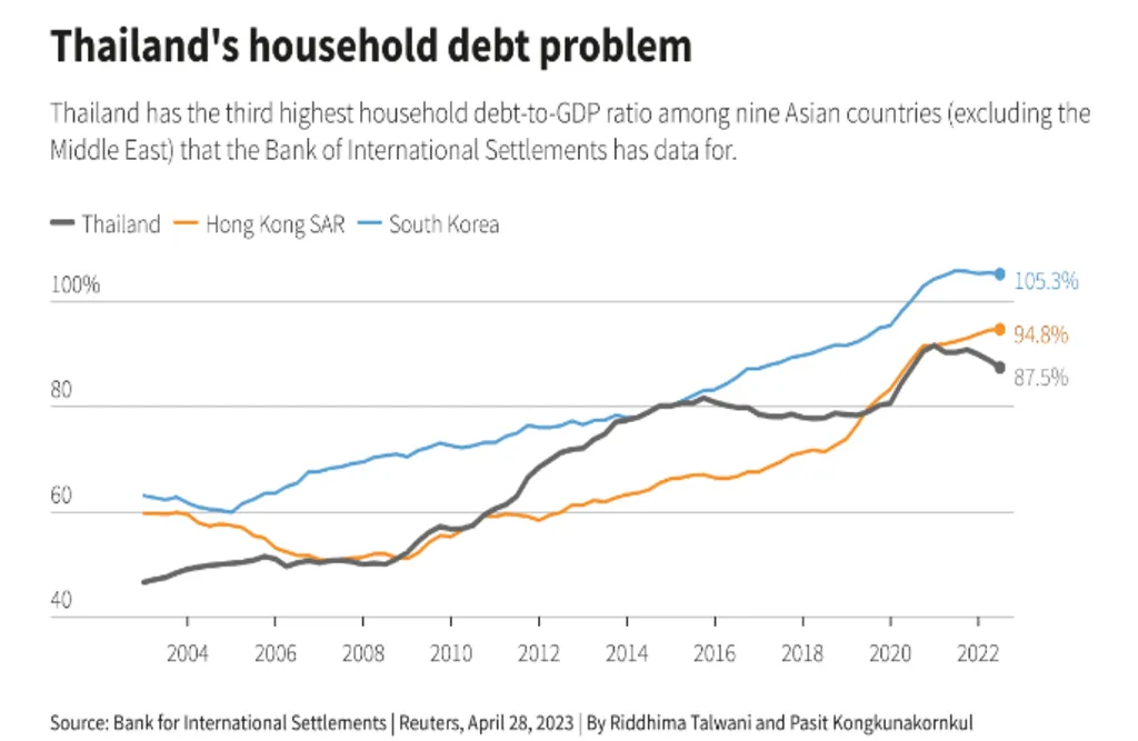 Thailand’s household debt problem is deep-rooted. The country’s household debt ratio stands between 86.8% and 91.3% of GDP, among the highest in Asia. With a total estimated household debt of 16.3 trillion baht, this level of debt has long held back growth and weakened consumer spending power. Many households struggle with overdue payments and mounting interest costs that leave little room for daily spending or saving.
