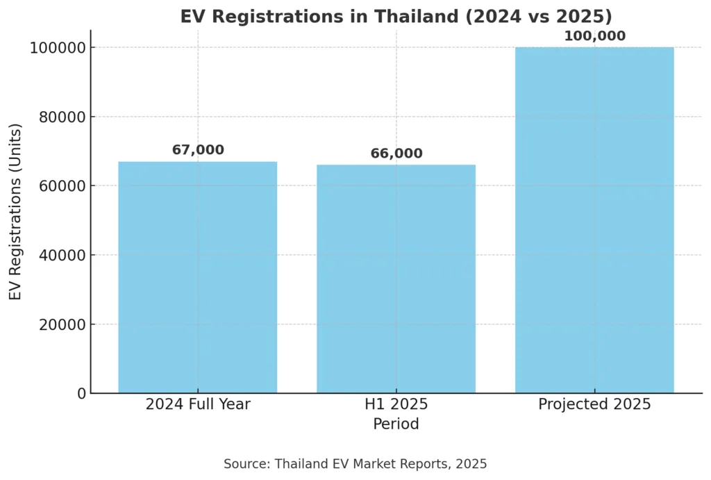 Thailand’s electric vehicle (EV) market is moving at an unprecedented pace. In just the first seven months of 2025, EV registrations reached 66,000 units. This nearly equals the full-year total of 67,000 units in 2024. The surge highlights how quickly the Thailand EV Market Accelerates, reshaping the country’s automotive industry.