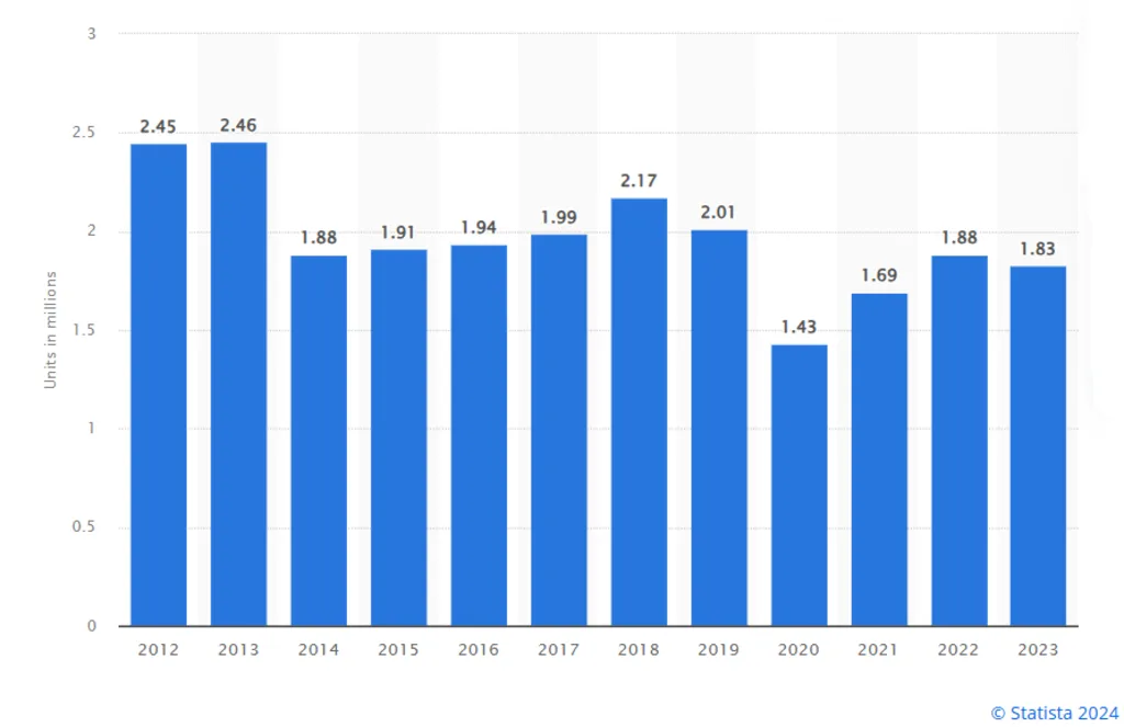 Vehicle manufacturing in Thailand has evolved significantly since the 1960s when the government began importing automotives to support economic expansion. Initially focusing on vehicle parts, especially bodies and suspensions, Thailand has since expanded its production capacity. In 2023, the country produced 1.83 million units, with passenger cars comprising more than 637 thousand units. This growth reflects Thailand’s enhanced manufacturing capabilities and its strategic role in the global automotive industry.